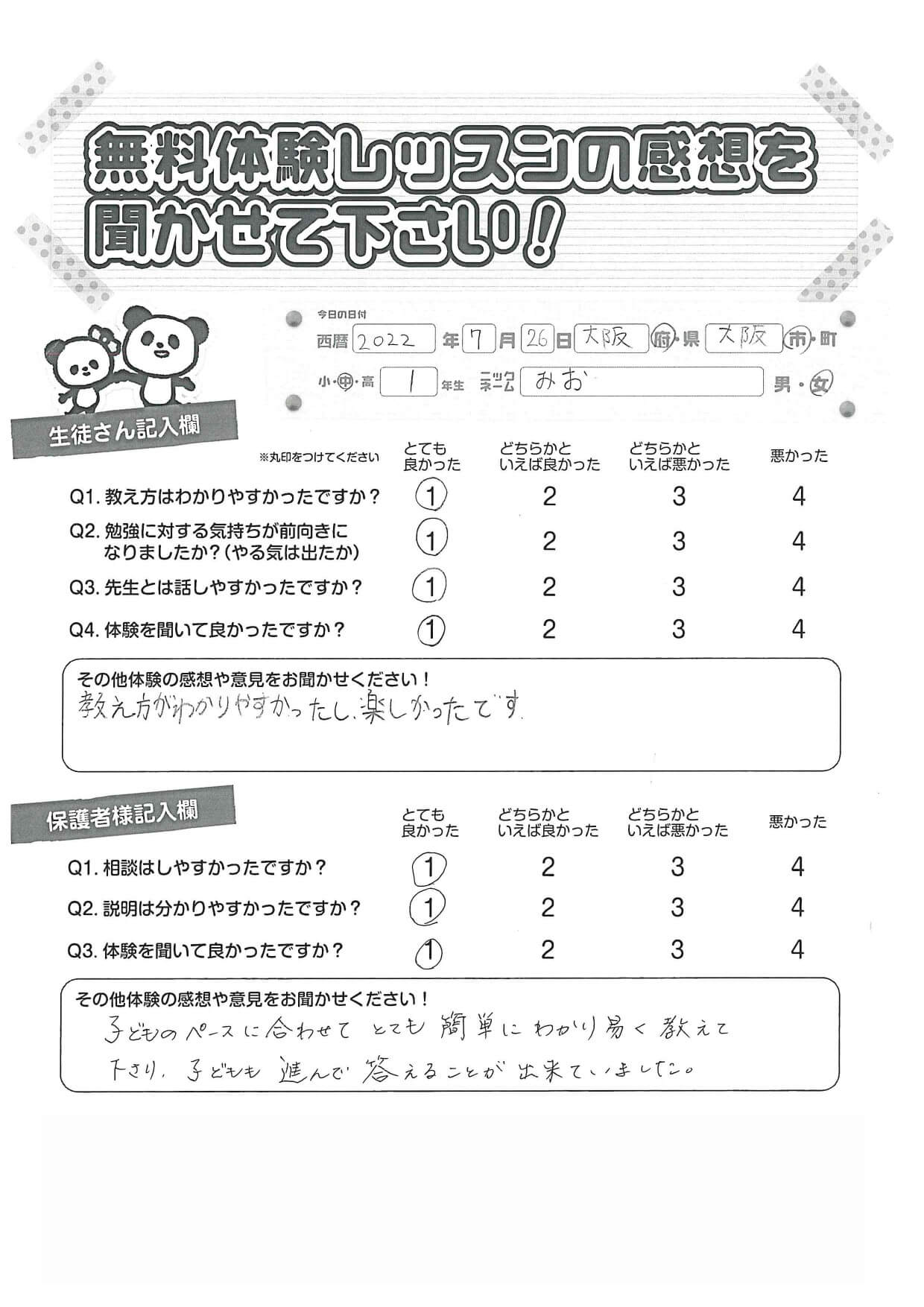子どものペースに合わせてとても簡単に分かりやすく教えて下さり、子供もすすんで答えることが出来ていました。