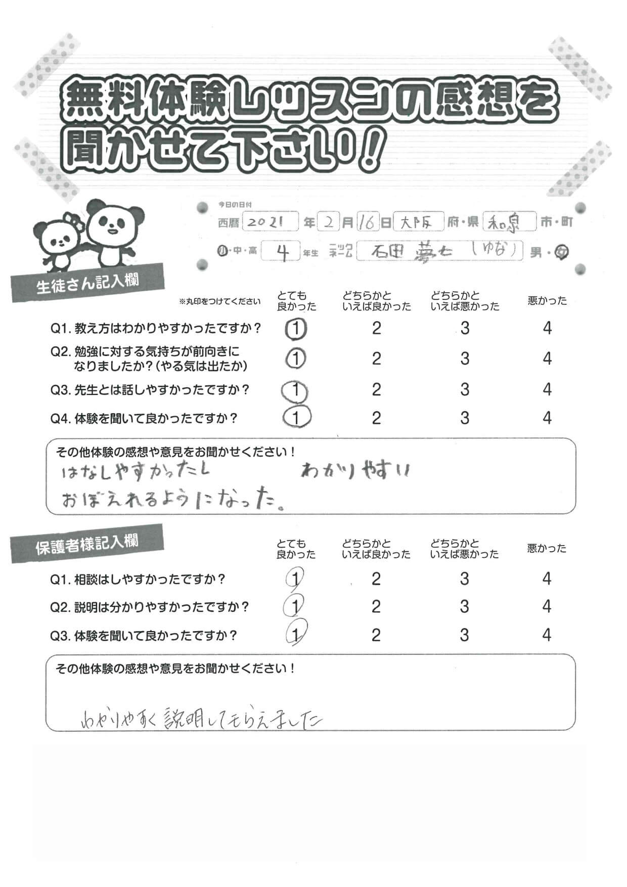 小学4年生 ゆなちゃん話しやすかったし覚えられるようになった。分かりやすい。